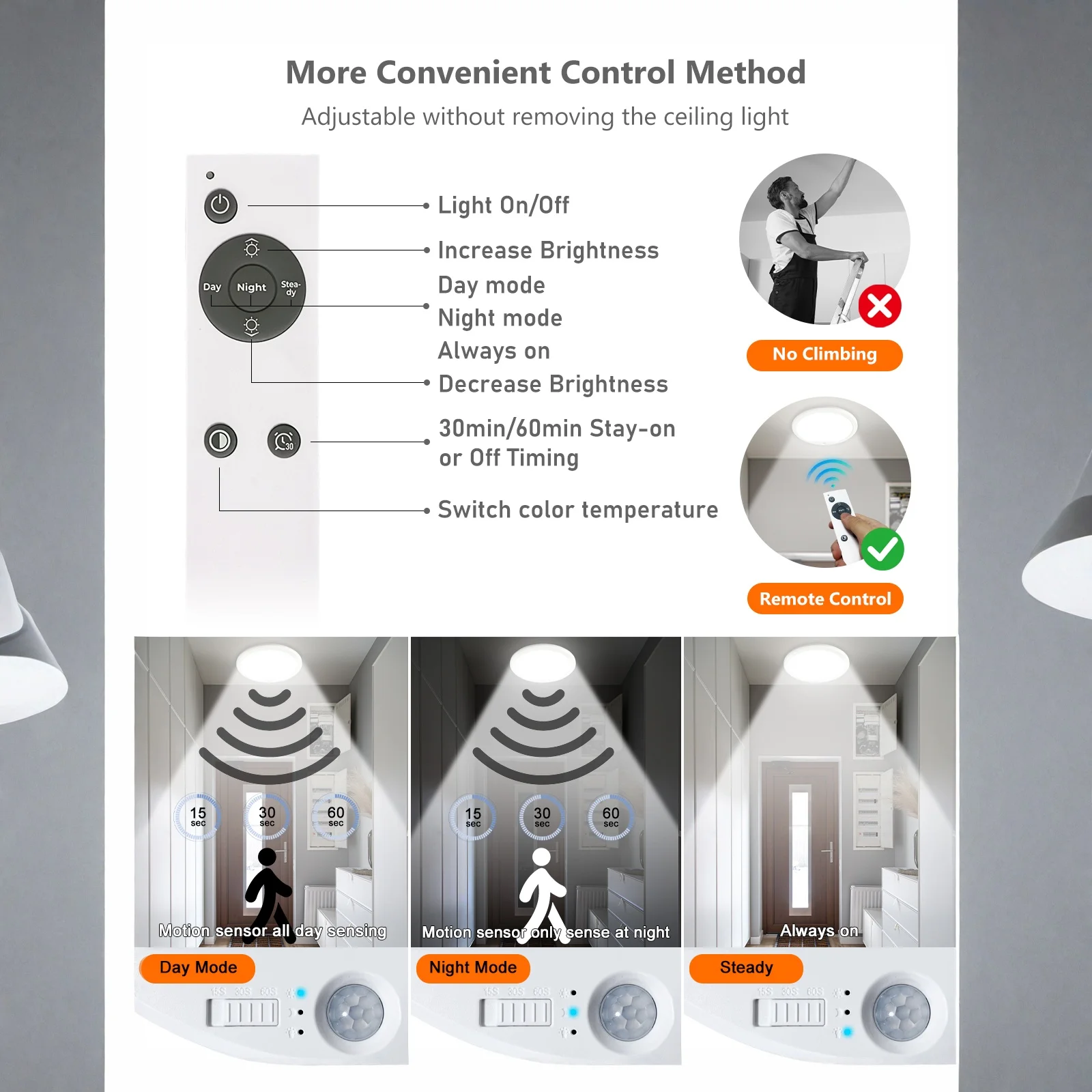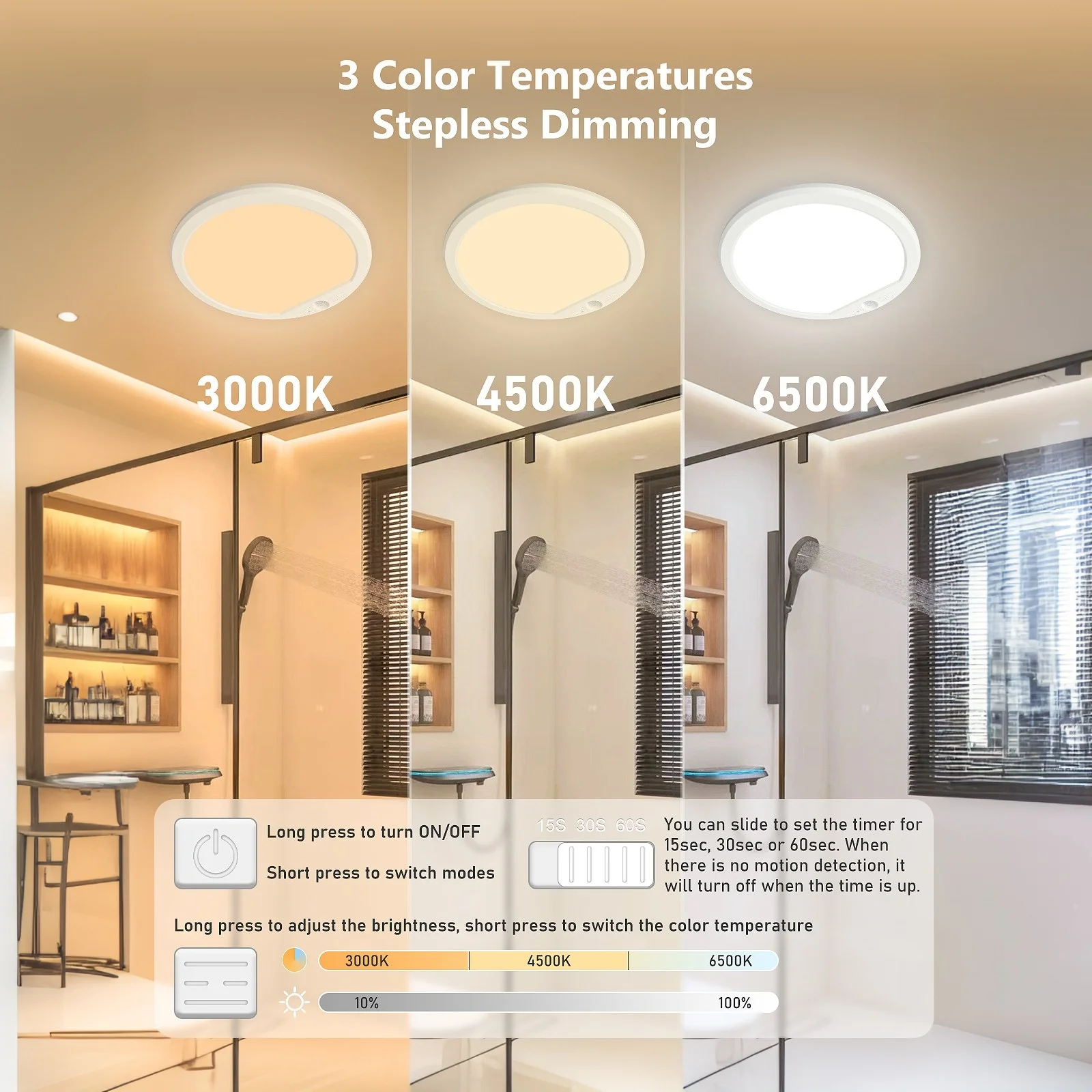 - Timer Options: Auto-off after 15, 30, or 60 seconds of no motion.